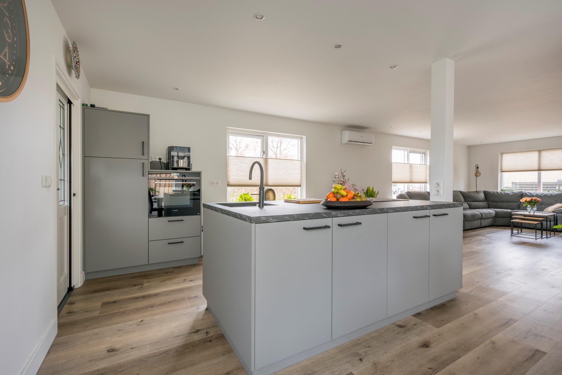 Entree. Vanuit de hal met toiletruimte komt u in de woonkamer en de slaapkamer op de begane grond. De raampartijen zorgen voor veel lichtinval in de woonkamer en de open keuken. Het zitgedeelte is aan de voorzijde gesitueerd en het eetgedeelte aan de achterzijde geeft u een prachtig uitzicht op de achtertuin met het terras en tuinhuis. ‘s Avonds zorgt de verlichting in de tuin voor een sfeervol geheel. De kook- en spoeleiland zorgt voor een sociale en strakke uitstraling. Daarnaast ie er een kastenelement voorzien van diverse inbouwapparatuur. Vanuit de keuken komt u in een tweede hal welk u toegang geeft tot de achtertuin met terras, badkamer en de aangebouwde garage. De badkamer met luxe uitstraling is voorzien van een ligbad, dubbele wastafelmeubel, douche en een 2e toilet. In de aangebouwde garage treft u de aansluiting voor de wasmachine en de droger en hier zijn ook de warmtepomp en boiler geïnstalleerd. Ook via de garage een praktische loopdeur naar de achtertuin. De hal, slaapkamer, woonkamer en open keuken zijn voorzien van een fraaie pvc vloer.